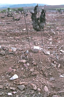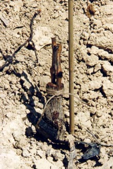 Greffe de Grenache N sur 110R, sur vigne de 11 ans initialement en Alicante Bouschet (avant buttage). Mi juin 1996 à St Nazaire des Gardies (Gard). |