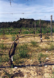 Greffe de Clairette B sur Terret B conduit en gobelet. Début septembre 2003 (an n) à Châteauneuf-du-Pape (Vaucluse). |